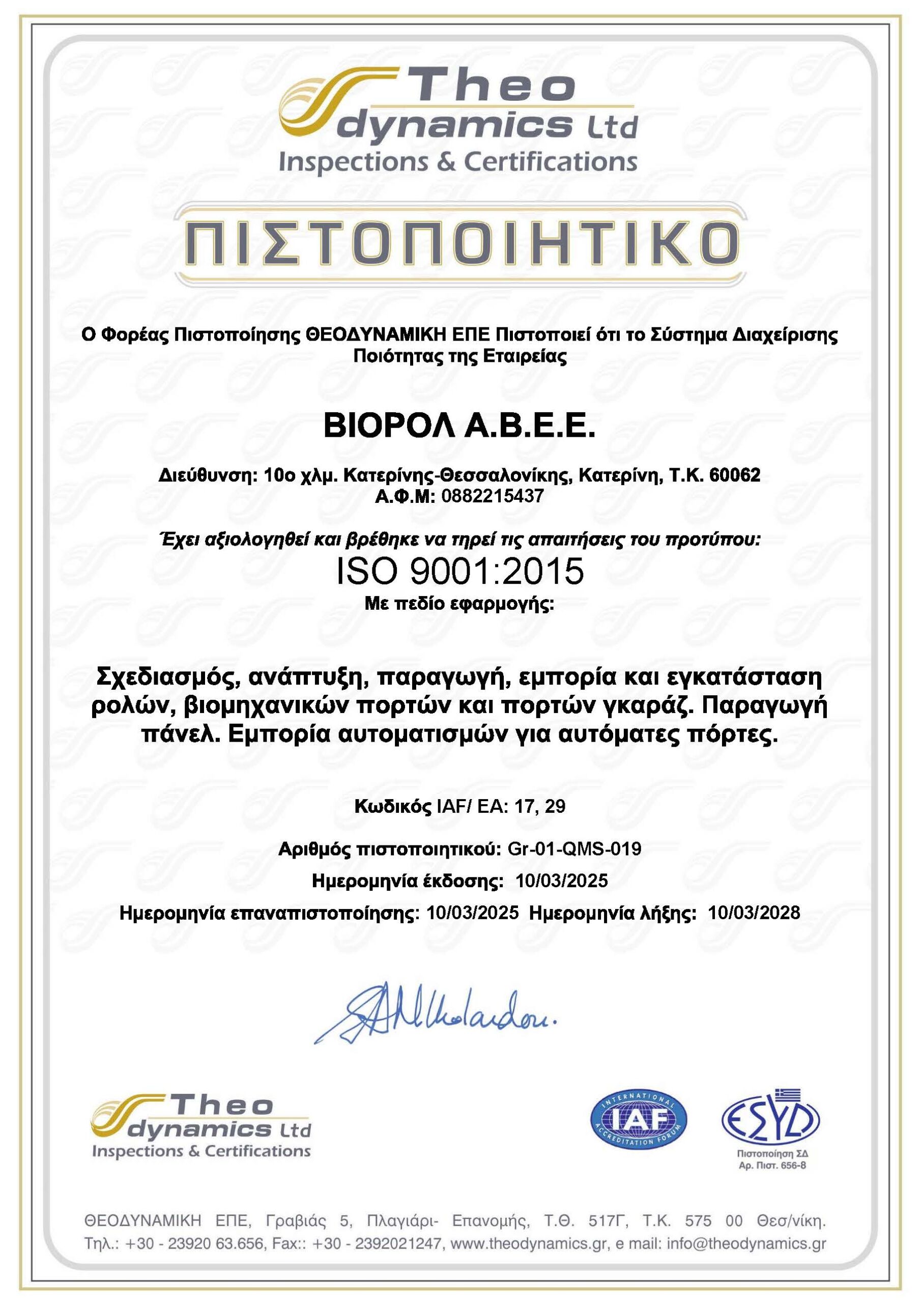 BIOROL S.A. has been assessed and found to meet the requirements of the standard ISO 9001:2015 for the following scope of operation: